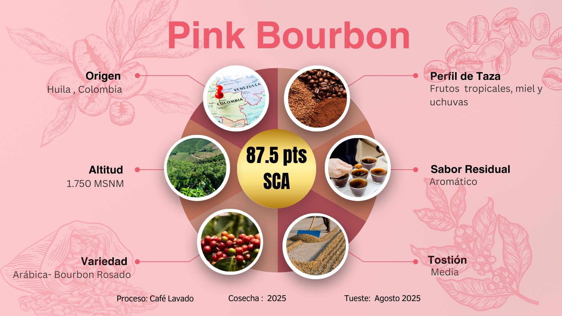 🌍 100% colombiano, arábigo variedad Bourbon Rosado, cultivado en altura